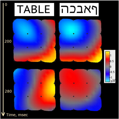 现在,如果我从这8个空间通道中各取一个或10个连续且并行的电压水平时间样本,如何创建一个MATLAB图或散点图,如下图所示,用“热”和“冷”区域插值电位的分布?