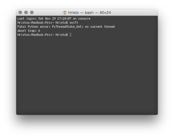 Hristos-MacBook:~Hristo斯威夫特 致命Python错误: PyThreadState_Get:没有当前线程 中止陷阱:6