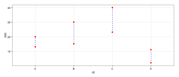 下面是使用ggplot的解决方案。还不清楚您的数据的格式是什么,因此假设数据框架包含id ( and )、min和max列。