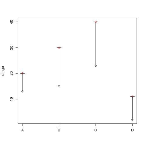 我有对范围的观察,例如:A 13-20,B 15-30,C 23-40,D 2-11,我想在R中绘制它们的起始值和结束值。13和20的A(上限和下限,如果你可以说),以便可视化和找出哪些范围是共同的某些组合的观察。在R中有什么快速的方法可以做到吗?我认为这是一个很小的问题,我有,但我想不出无论如何,现在去做。