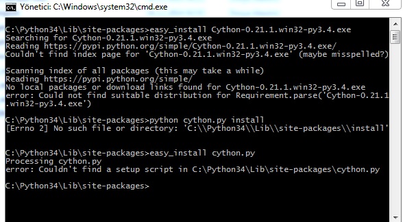 后者将更简单。您可以在这里找到二进制文件:http://www.lfd.uci.edu/~gohlke/pythonlibs/#cython。下载与bitness和Python版本相对应的二进制文件。例如,如果您使用的是Python3.4,并且您的系统是32位,您可以下载Cython‑0.21.1.win32‑py3.4.exe。将其保存到您知道路径的位置.(一个简单的选择就是将其保存到C:\目录中)。然后在下载的文件上运行easy_install,类似于以下内容: