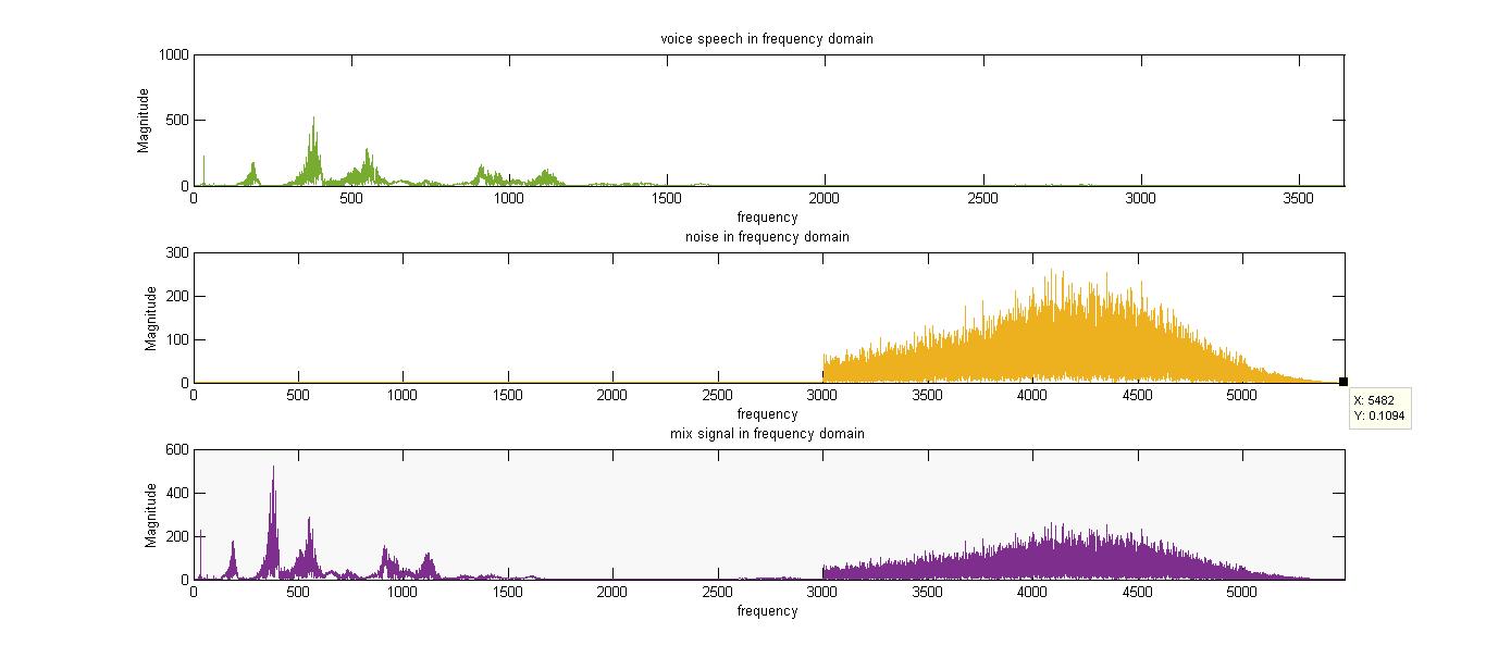 %-- plotting voice speech, noise and mix in frequency domain --%