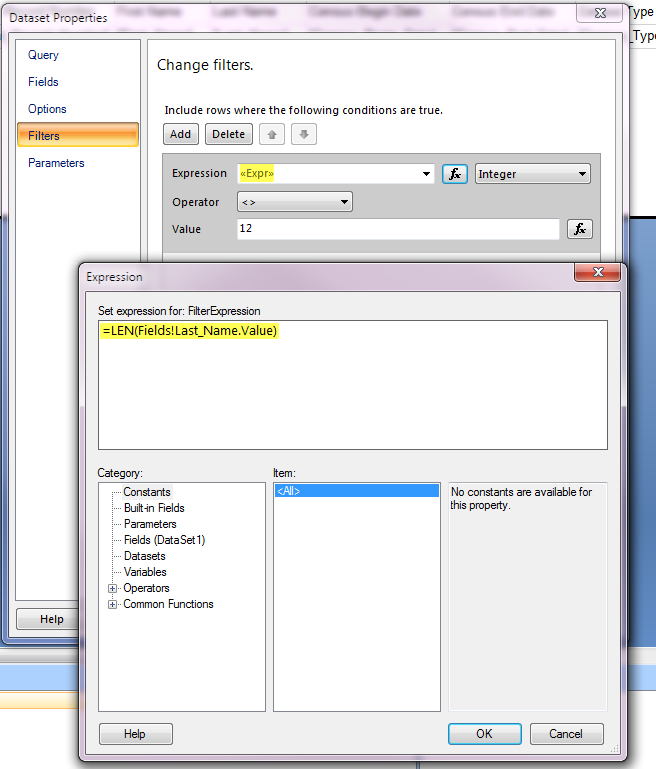 在数据集中的Dataset属性中使用筛选器选项。添加一个新的过滤器。对于表达式,单击fx按钮并输入: