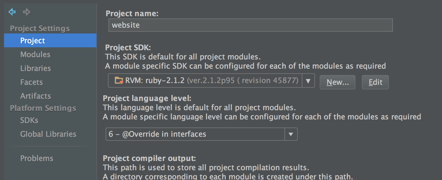 我在intellij中有一个Rails项目,但不知怎么的,语言级别似乎设置为1.8。我得到了以下配置: