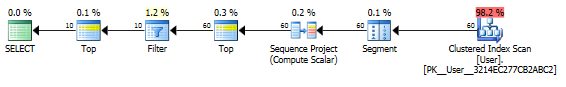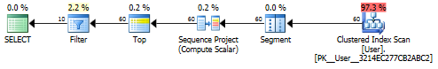 Top运算符确保只从聚集索引中读取60行,筛选器筛选出前50行以返回最后10行。