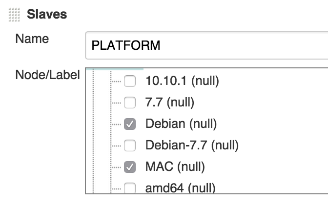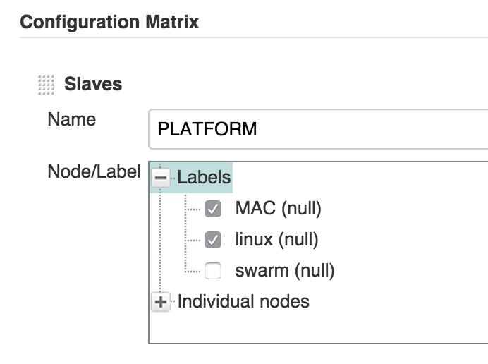 当我在Jenkins中寻找类似的特性时,我发现了多配置项目。我知道我们可以为平台定义一个轴,但是我无法理解如何为特定的平台指定特定的从节点。我不希望在所有从节点上执行构建。对于构建参数和build命令也可以这样说。对于每个构建配置,我可能需要不同的参数和构建命令。