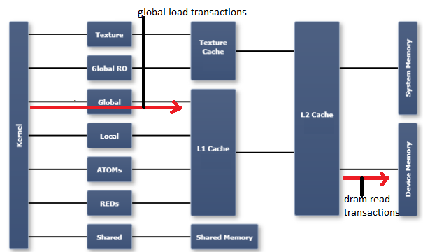 从根本上说,全局负载是由翘曲执行的指令发出的。这些加载的初始目标将是L1或L2缓存(通常)。如果缓存内容满足全局负载,则永远不会成为dram读取事务。另一方面,如果全局加载的目标不在缓存中,则它将成为dram事务(通常/通常)。
