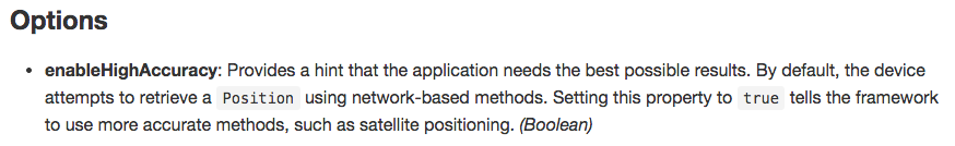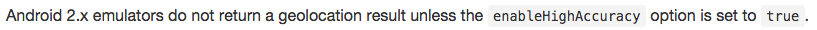 enableHighAccuracy没有设置为true,仿真器将不会返回任何内容;不管您是否安装了GPS。enableHighAccuracy设置为true,但这将意味着您必须使保持打开。https://stackoverflow.com/questions/27439443