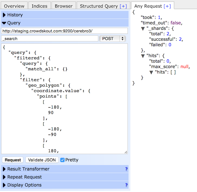 嗨,我正在使用正式文档中的查询语法geo_point ]在ElasticSearch中查询几何多边形滤波器,但是没有返回结果。