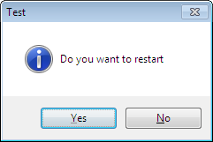 int MsgRet = ::MessageBox(NULL,L"Do you want to restart",L"Test",MB_YESNO | MB_ICONINFORMATION);