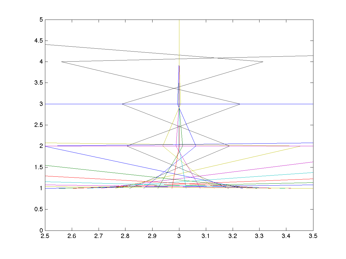 axis([2.5 3.5 0 5])X(I)是一个开始值的列表--收敛到根,图中显示y轴上的迭代数,以及在x轴上对该迭代的猜测。您可以跟踪每个起始值并查看发生了什么。