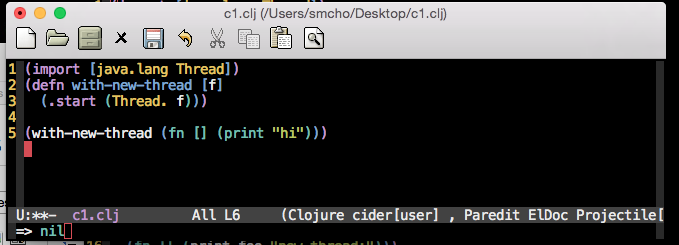 (with-new-thread (fn [] (print "hi")))但是,当我在emacs中运行它时,它是以粘液-repl模式(用cider-jack-in执行)运行的,没有打印出来,但是没有返回。