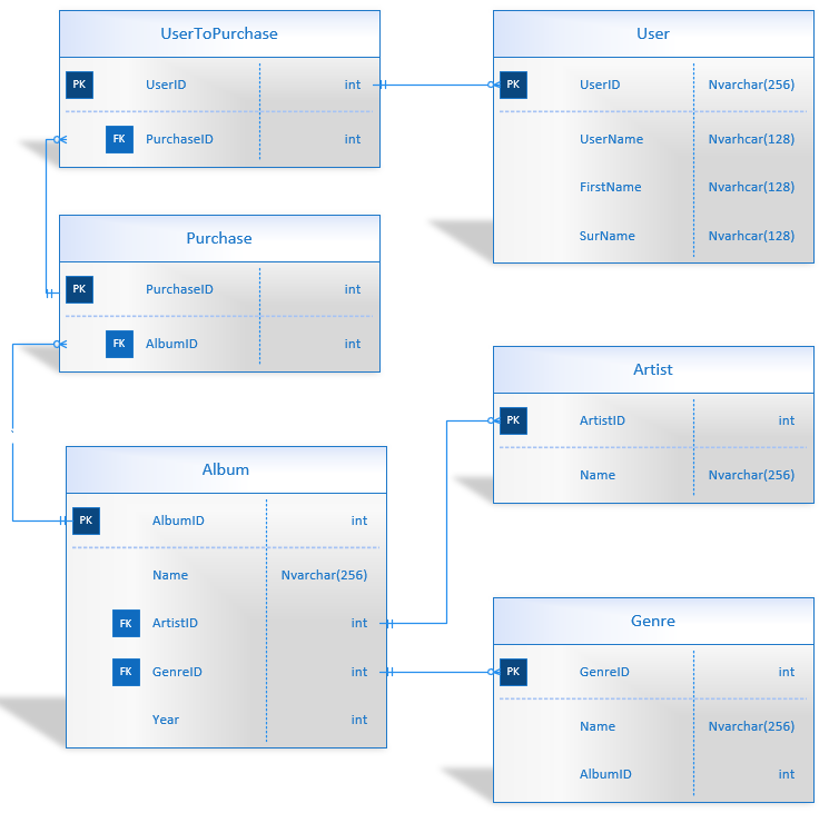 请注意:除非您的系统是用来跟踪奴隶劳动的,否则我认为PurchaseTbl中的PurchaseTbl实际上应该是AlbumID,因为用户最有可能购买的是专辑,而不是个人。
