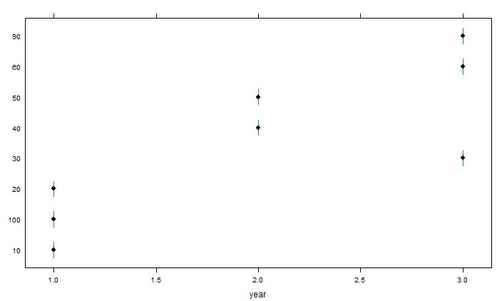 bwplot(score~year, dd, horiz=FALSE)(这假设year是样本数据中的一个因素。如果是数字,请使用factor(year))