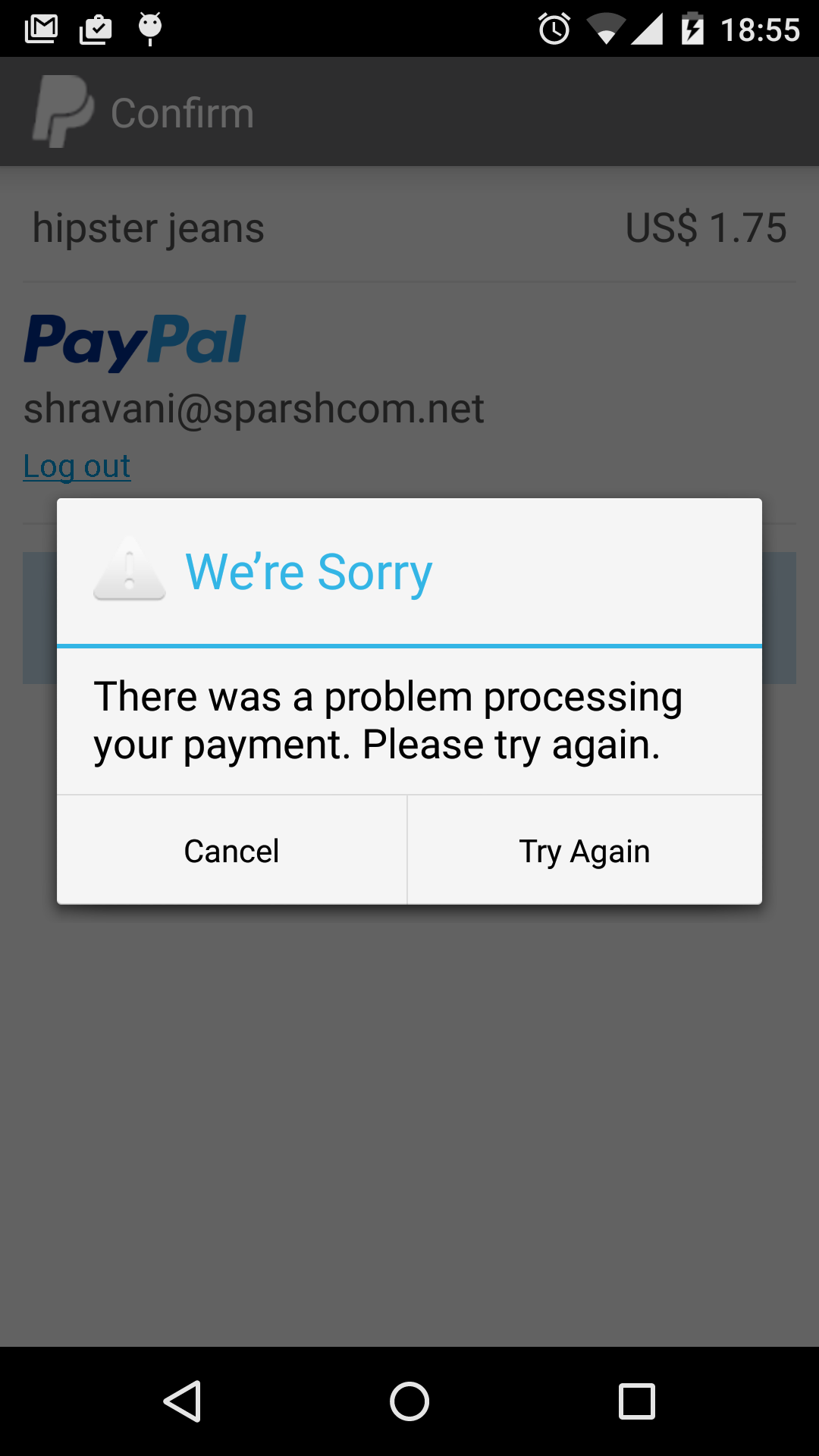 我已经将我的android应用程序与Paypal集成在一起,我已经用paypal沙箱凭证对其进行了测试。使用其他凭据进行测试,我已经创建了另一个帐户,当我测试这个帐户时,我收到错误的信息.