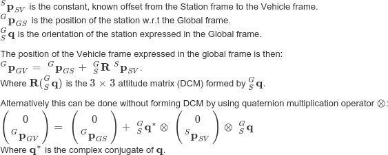 我用乳胶写了这个表达式,但不幸的是,StackOverflow不支持它,所以我把它作为图像附在一起。原来的乳胶可以找到这里。例如,在下面的表示法中,第一行Sp_SV是Vehicle w.r.t的position。S,用(旋转的)S表示。前缀上标表示旋转框架。例如,对于四元数G_Sq,这表示从G圆框到S符号帧的方向。