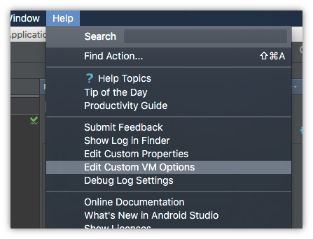 从AndroidStudio2.0开始,您可以通过访问“帮助”菜单中的“编辑自定义VM选项”文件来创建/编辑该文件。