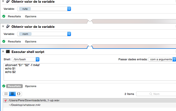 多亏了这个职位,我才知道如何在Automator中将变量传递给shell脚本,但是现在这个脚本不起作用了,当终端运行良好时。我漏掉了什么?试着用和不带引号。另外,该脚本用于将音频转换为任何格式,在本例中为m4r铃声格式。