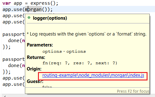 使用tern (您的项目有.tern- project )时,当您在Router()上鼠标移动时,您应该会看到“源”是可单击的。