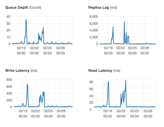 但是,如果有人发现了这个主题,下面是CloudWatch在您用完GP2学分后的样子。正如您可以看到的,读和写IOPS图表并没有告诉我们太多,但是读/写延迟图显示了大量的尖峰。