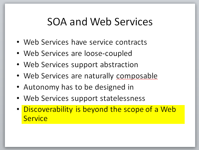 Discoverability is beyond the scope of a Web Service这是否意味着,webservice没有处理发现部分?我的意思是,服务提供者将他们的the服务提交到服务注册中心,以便客户机能够发现它,不是吗?这就是那点意思吗?