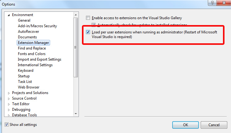 工具-选项-环境-扩展管理-加载每个用户扩展.