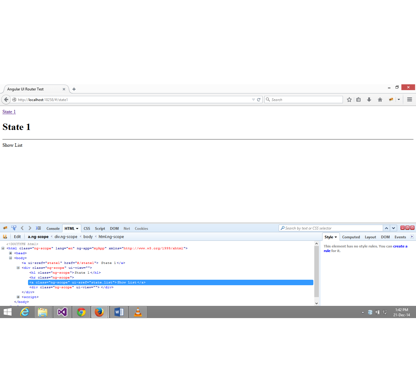 Html代码是<a ui-sref="state1.list">Show List</a>,浏览器代码是<a ui-sref="state.list" class="ng-scope">Show List</a>,因为要重命名state1以声明我的另一个部分视图没有调用并给出错误。
