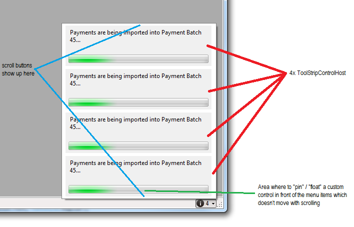 简而言之,我想要一些类似于ToolStripControlHost的东西,但我需要将它“固定”在菜单的底部,主要是因为当有很多项时,它不会像其他菜单项那样滚动。