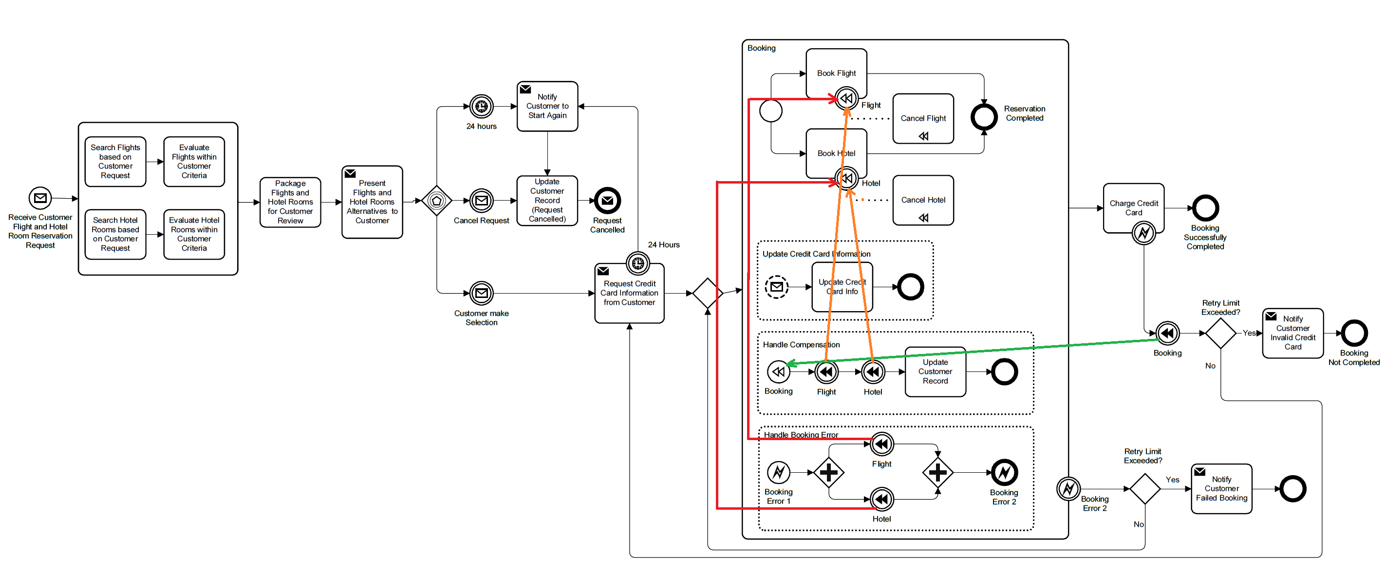 我有一个关于在bpmn2中抛出/捕捉/处理补偿事件的机制的问题。基于Travel Booking Example在bpmn2为例,我们有一些compensation intermediate throwing events,compensation boundary events和compensation handler。在这个图中,我将抛出和捕获补偿事件(与我对事件的了解)联系在一起: