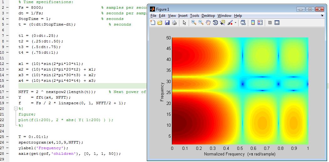 x(I) = x4(I);然后,您可以在时域( x )绘制新的信号plot(x),以确保这是您想要的。最后,您可以执行您的spectrogram。