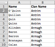 我有爱尔兰/苏格兰宗族名称的列表,我需要将其放入搜索模块使用的格式中。以下是问题所在:
