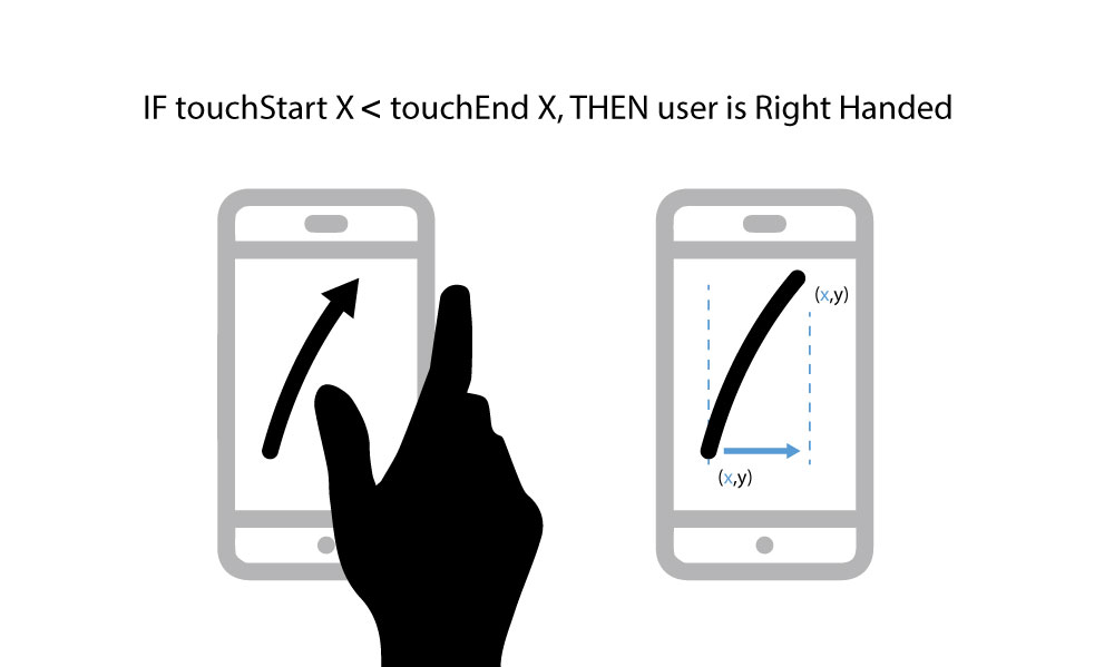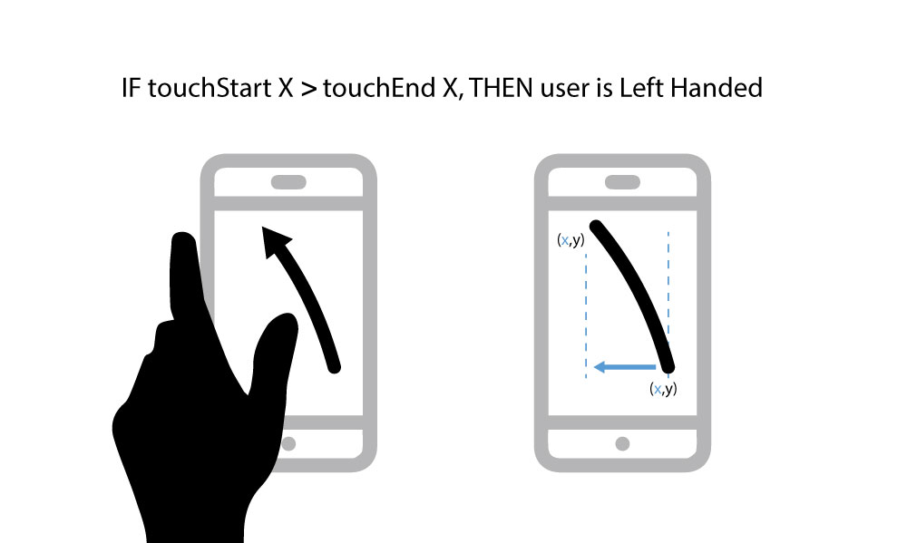 这里有一种方法--可以推断,如果用户是左手的,他们将使用左手拇指在页面上上下滚动。现在,根据拇指旋转的方式,向上滑动自然会使滑动的弓向外移动。对于触摸事件,如果touchStart X大于touchEnd X,则可以推断它们是左手的。对于一个右撇子来说,情况正好相反--如果touchStart X小于touchEnd X,你可以推断它们是右手。见这里: