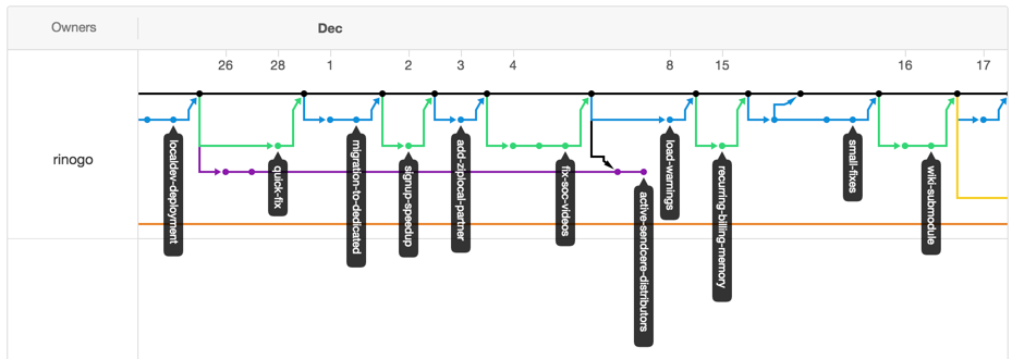 我喜欢GitHub的“网络图”视图。我喜欢它可以给我一个关于存储库随时间的进展的概述: