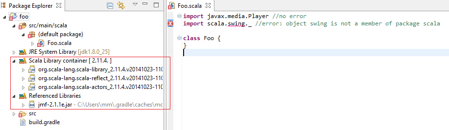 导入javax.media.Player //no错误导入scala.swing._ //错误:对象swing不是scala类Foo {}包的成员foo并运行gradle eclipseimport -> General -> Existing Projects into Workspace -> Browse -> Foo然后,我在Foo.scala的第2行得到一个错误,它读取object swing is not a member of package scala。左边面板上的Referenced Libraries列表仅显示javax.media的jmf-2.1.1e.jar,如下图所示