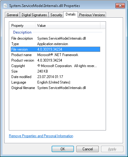 期待下一个问题:那么System.ServiceModel.Internals.dll的正确修订是什么呢?你可以打电话给微软支持,他们会告诉你:“没有”。但你已经知道了。所以别这么做。如果您想让这个方法起作用,那么一个基本的策略是首先查看System.ServiceModel的修订号,然后尝试找到一个System.ServiceModel.Internals,如果它的修订号不相等,那么至少在大致上是这样的。您现在拥有的版本几乎肯定是不接近的,版本34234大致上是一个.NET 4.5.2修订号。