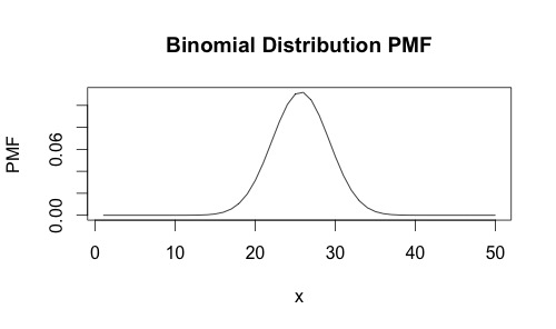 plot(x,dbinom(x ,size = 50,prob = 0.513),type="l", ylab="PMF", main="Binomial Distribution PMF")结果是: