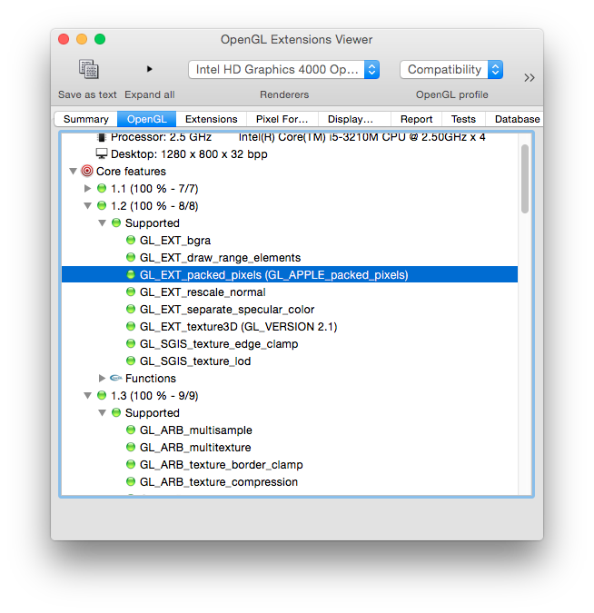 我的应用程序在使用打包像素格式(如GL_EXT_packed_pixels )之前检查UNSIGNED_INT_8_8_8_8_EXT扩展。在我的MacBook上,我的代码找不到这个扩展,尽管使用打包的像素格式看起来仍然有效。