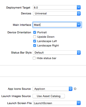 - **XIBs/Storyboards**: Another, separate way to provide a launch image is via the _Launch Screen File_ setting, i.e., a XIB or Storyboard file. They are iOS 8 (and later) only: If you support older versions (which you do not seem to do), you still need to provide static files. Else you can ignore static files and only have a XIB/Storyboard. It takes precedence over static files, so if you supply both and run on iOS 8, the XIB/Storyboard will be used.