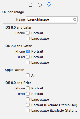 application:willFinishLaunchingWithOptions:或application:didFinishLaunchingWithOptions:中)创建所有内容(包括主application:willFinishLaunchingWithOptions:),则可以将该字段保留为空。如果您的应用程序按预期工作,这里不要做任何更改。- **Static PNG files**: You have to provide files for every screen size that you want to support. These are a lot (especially for universal apps). Again, you have two options to tell the system about your files: You can follow the age-old **naming convention**, i.e., you name the files `Default.png`, plus a suffix for all the different variants, e.g., `Default@2x.png` (iPhone 4 and 4s), `Default~ipad.png` (non-retina iPads) etc. The format is documented [here](https://developer.apple.com/library/ios/documentation/2DDrawing/Conceptual/DrawingPrintingiOS/SupportingHiResScreensInViews/SupportingHiResScreensInViews.html#//apple_ref/doc/uid/TP40010156-CH15-SW8). 非常麻烦,您可以使用资产目录来处理命名,但是仍然需要提供所有不同的PNG文件。单击时,Xcode将为您创建一个启动映像资产(即图像文件的集合)。如果以后要重命名资产(不一定要使用LaunchImage或Default作为资产名称),只需使用替换use按钮的字段即可。