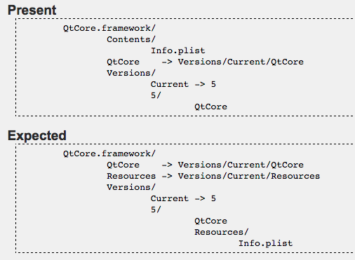 根据苹果的文档,框架包没有“内容”文件夹。相反,每个版本文件夹都会得到一个“参考资料”文件夹,其中包含Info.plist文件,并且在顶层框架文件夹中也有符号链接。Qt5框架在SDK构建后有不正确的布局,所以这不仅仅是macdeployqt的问题,而是整个框架组装部分的问题。