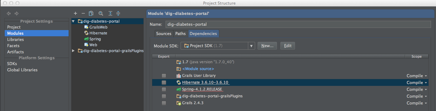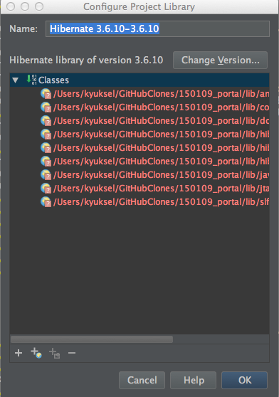 原来我应该通过Intellij的对话框手动指定Hibernate的版本(在Mac上是通过文件->项目结构)。单击依赖项,您将看到如下所示: