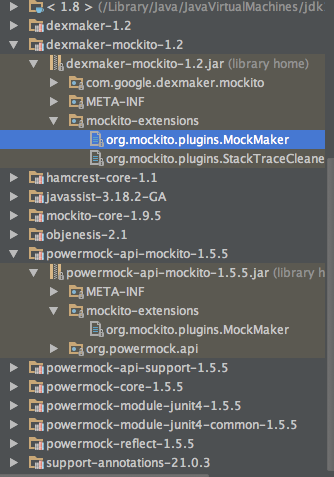 File 2: ~/.gradle/caches/modules-2/files-2.1/com.google.dexmaker/dexmaker-mockito/1.2/b99884a4c6ef6335ba376f79aa79632b2421c17c/dexmaker-mockito-1.2.jar查看jar结构时,我注意到Dexmaker和Powermock都在mockito-extensions中声明了一个mockito-extensions。