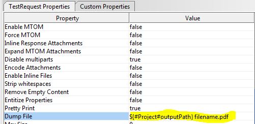 第二个问题是展开需要使用#Project#的项目属性,因此在您的示例中,testRequest中的转储文件使用${#Project#outputPath} filename.pdf insted of (${outputPath})+filename.pdf,如下所示: