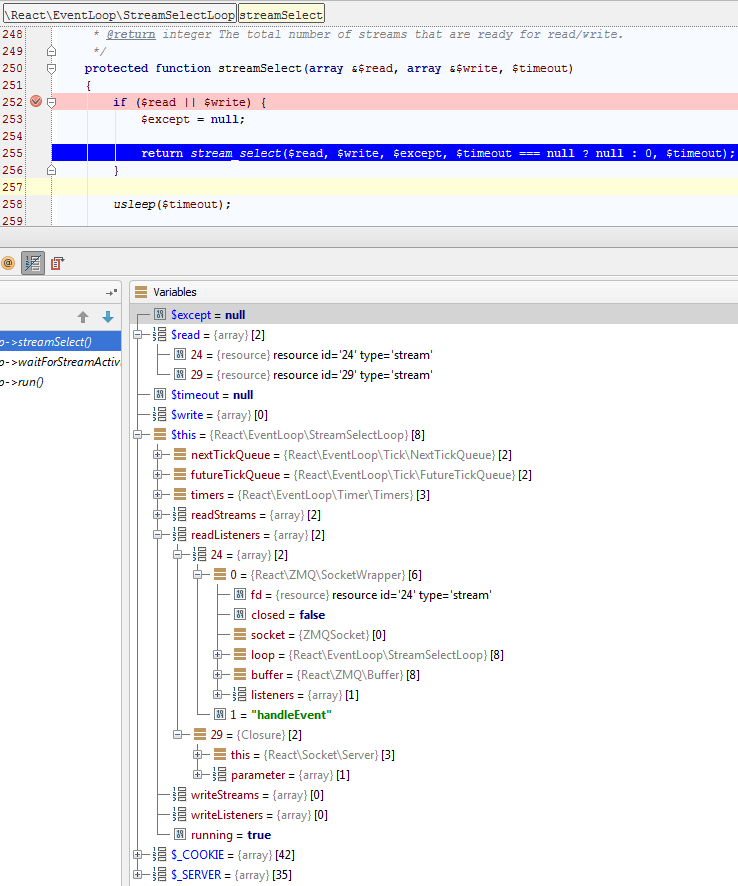 0.0130 1402384 5. stream_select() [...]\vendor\react\event-loop\StreamSelectLoop.php:255\vendor\react\event-loop\StreamSelectLook.php中的引用行是: