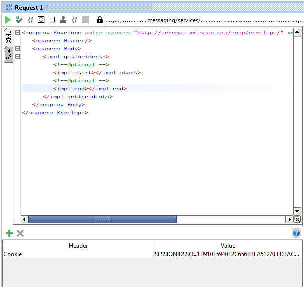 在soapUI中,使用从浏览器获得的相同值创建一个标头属性,并运行请求。请求将使用保存在cookie中的相同的会话id(JSESSIONID)来运行请求。下面的图像显示了如何将cookie值添加到标头中。