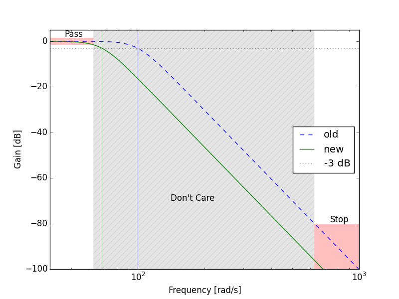 当你设计一个巴特沃斯过滤器与纽扣,没有足够的自由度,以满足所有的设计限制。因此,可以选择过渡区域的哪一端达到约束条件,哪一端是“过度设计”。在ciply0.14.0中所做的更改将该选择从停止带边缘切换到了通带边缘。