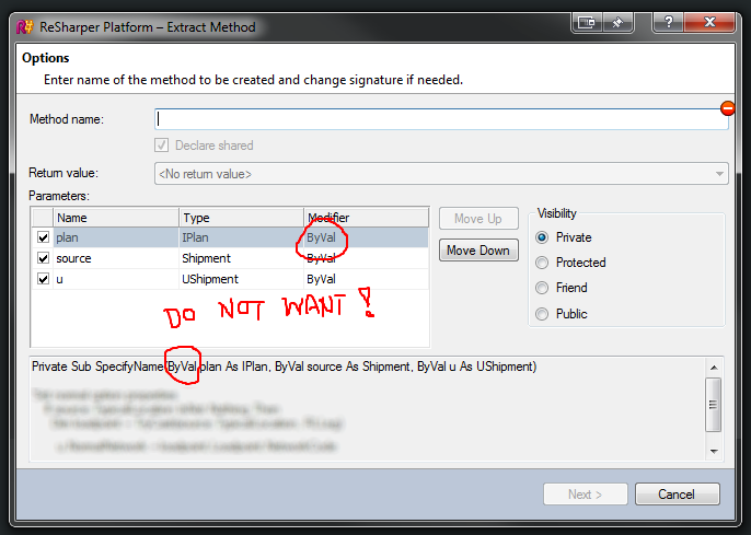 当我进行提取方法重构时,ReSharper总是希望将ByVal修饰符放在任何地方。显式放置ByVal不再是必需的,Visual本身也是doesn't do that anymore。