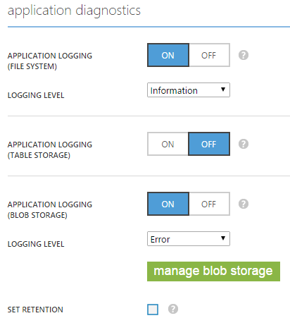 我有一个Windows网站(使用ASP.NET网页构建),并且在配置中为Blob存储和文件存储启用了“应用程序诊断”: