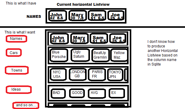 我有一个水平的列表。效果很好。我的ArrayList eList将显示屏幕上有一个ListView。太好了。我的问题是,eList有多个行,这意味着eList可能是飞机、汽车和船只,也可能是无限数量的对象。目前,这个水平ListView将只显示数据库中的所有类型的飞机或汽车或船只。如何根据对象类型(飞机、汽车、船只、玉米饼、人员)垂直显示多个或无限数量的hListViews。