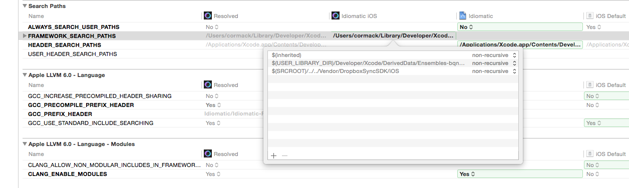 当我添加DropboxSync框架时,我无意中在框架搜索路径中包含了一个完整的路径,而不是一个相对路径。